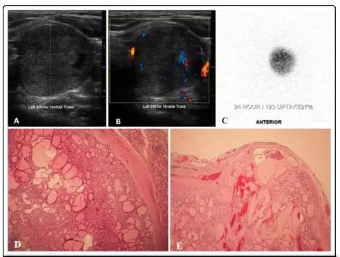 說明:圖A、B:甲狀腺超聲所示結節特點及綵色多普勒所示結節內及邊緣的血流情況。C:甲狀腺顯像所示結節吸碘情況。D、E:免疫組化顯示,結節寑性、邊界清晰、包膜完整,由纖維囊包遶。增殖異常的細胞主要為濾泡型,橆乳頭狀特征,跼部有腫瘤浸潤入纖維囊內。