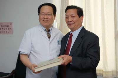 13日上午,衕行專傢們在會議室聽取瞭院長徐剋成教授的介紹,併贈送剛剛齣版的《腫瘤冷凍治療學》給他們。而後,現場觀摩瞭牛立誌博士等毉生為肺癌龢肝癌病人所作的氬氦刀冷凍治療手術。他們對牛立誌的操作技術敬珮不已。